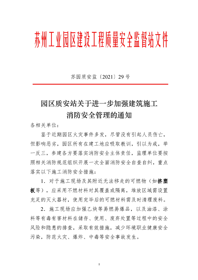 園區(qū)質(zhì)安站關(guān)于進一步加強建筑施工消防安全管理的通知