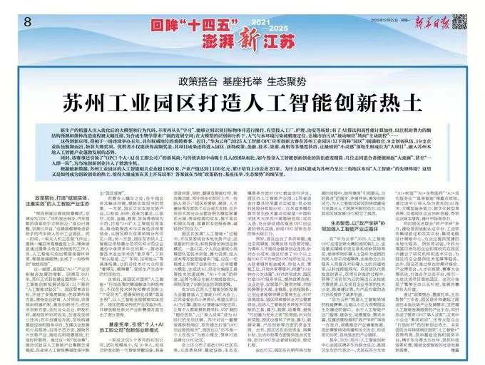12月22日,《新華日報(bào)》聚焦蘇州工業(yè)園區(qū),“政策搭臺(tái) 基座托舉 生態(tài)聚勢”,打造人工智能創(chuàng)新熱土。