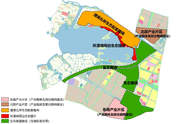 漕湖沿岸生態(tài)環(huán)境提升及產業(yè)升級項目主要建設內容包括生態(tài)提升、基礎設施、水系治理、產業(yè)載體及商業(yè)配套。
