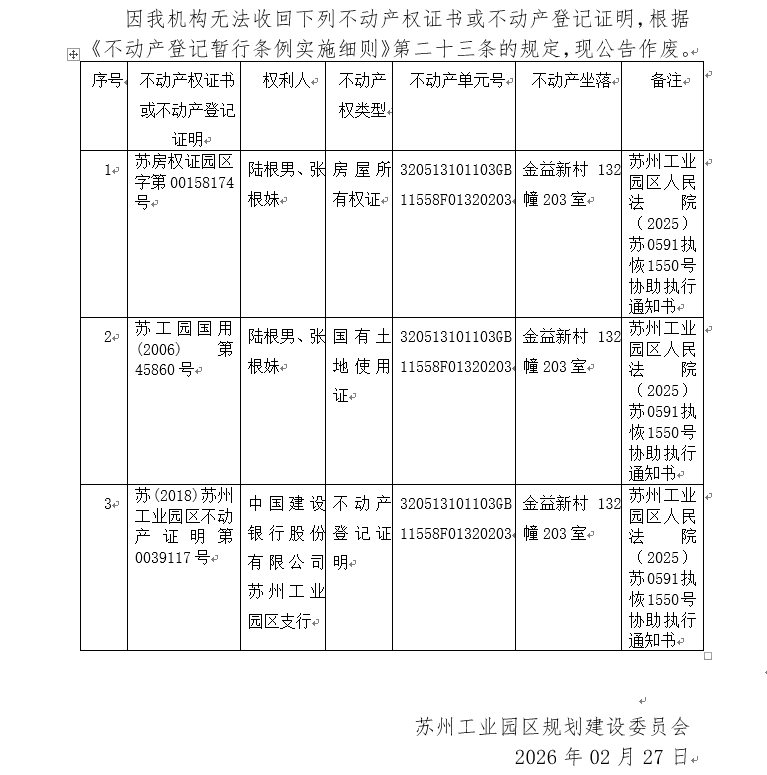 不動(dòng)產(chǎn)權(quán)證書/登記證明作廢公告蘇園 證廢字2026(0048)號(hào)(金益新村132幢203室)