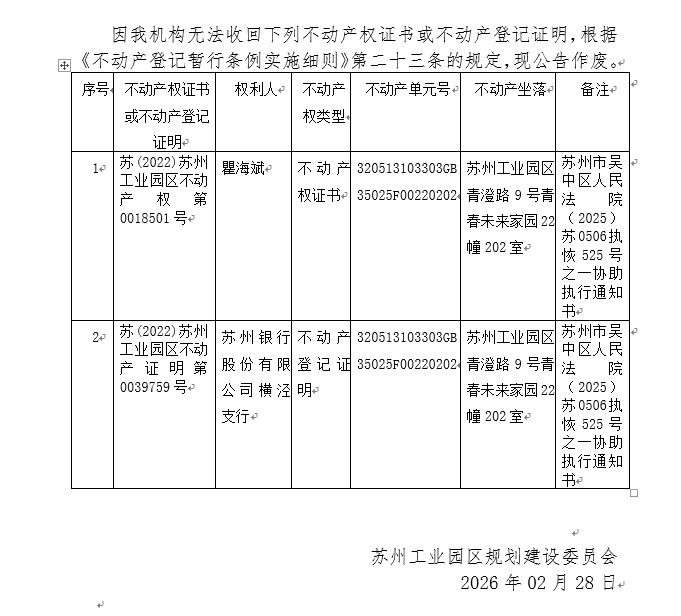 不動產權證書/登記證明作廢公告蘇園 證廢字2026(0056)號(青春未來家園22幢202室)