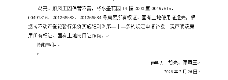 關(guān)于水墨花園14幢2003室00497815、00497816、201366583、201366584號房屋所有權(quán)證、國有土地使用證遺失聲明