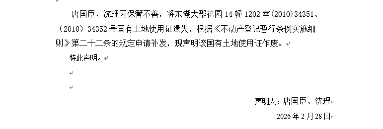 關于東湖大郡花園14幢1202室(2010)34351、(2010)34352號國有土地使用證遺失聲明