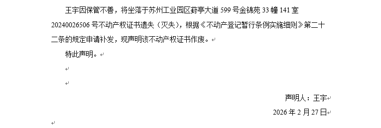 關于蘇州工業園區葑亭大道599號金錦苑33幢141室20240026506號不動產權證書遺失聲明
