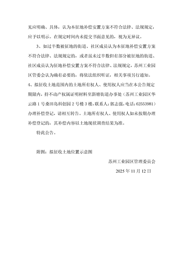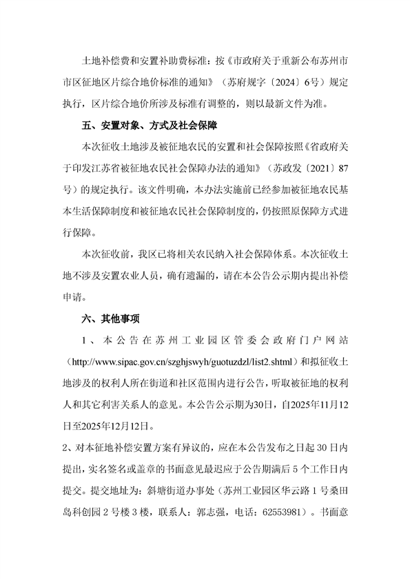蘇州工業園區管理委員會征地補償安置方案公告(蘇工園征補安置〔2025〕007號)