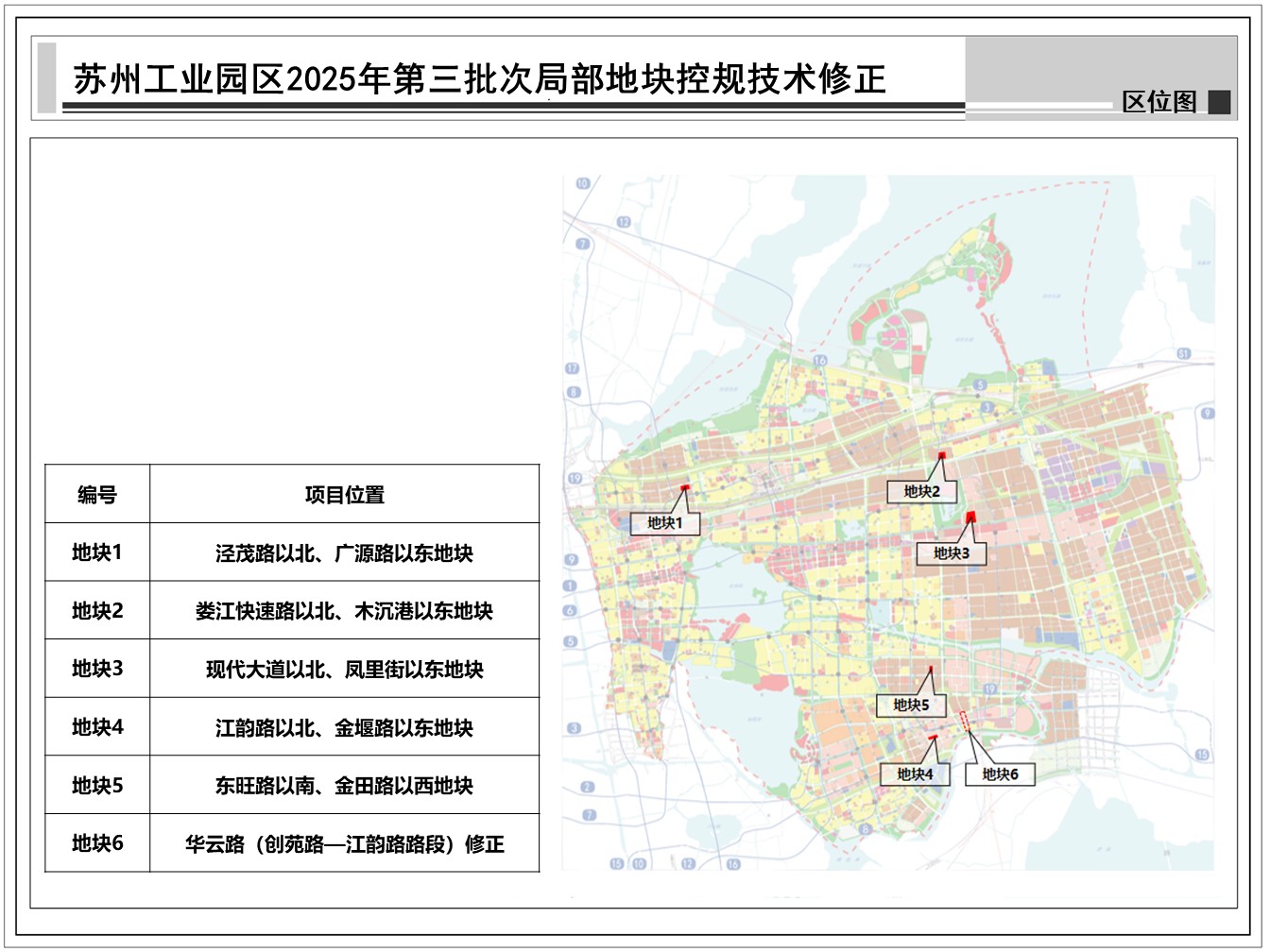 蘇州工業園區2025年第三批次局部地塊控規技術修正:共包括6個地塊,總用地面積約0.29平方公里,詳見附圖區位圖。