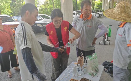活動(dòng)通過(guò)創(chuàng)意海報(bào)展示、養(yǎng)生知識(shí)分享及互動(dòng)體驗(yàn)環(huán)節(jié),向居民傳遞了豐富的夏季養(yǎng)生知識(shí)。海報(bào)圍繞“夏季飲食調(diào)養(yǎng)”“防暑降溫小貼士”“運(yùn)動(dòng)養(yǎng)生法”等多個(gè)主題展開(kāi),圖文并茂地介紹了如何在夏季保持身體健康。最吸引眼球的莫過(guò)于自制驅(qū)蚊水環(huán)節(jié)。居民們將簡(jiǎn)單易得的材料按比例混合,一瓶既安全又有效的驅(qū)蚊水便誕生了。這種自制驅(qū)蚊水不僅能有效驅(qū)趕蚊蟲(chóng),還避免了使用化學(xué)驅(qū)蚊產(chǎn)品可能帶來(lái)的健康風(fēng)險(xiǎn),真正實(shí)現(xiàn)了綠色健康的防蚊新風(fēng)尚。