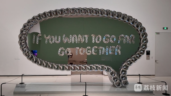 用藝術(shù)鏈接過去與將來,交流借鑒與創(chuàng)新發(fā)展同行。中國當代藝術(shù)標志性人物徐震的巨型裝置《結(jié)伴才能行遠》,以涂鴉文字和銀色長鏈構(gòu)成,傳遞中新結(jié)伴同行的概念,彰顯此次中新兩國文化交流展覽的愿景:面向未來,攜手并進。