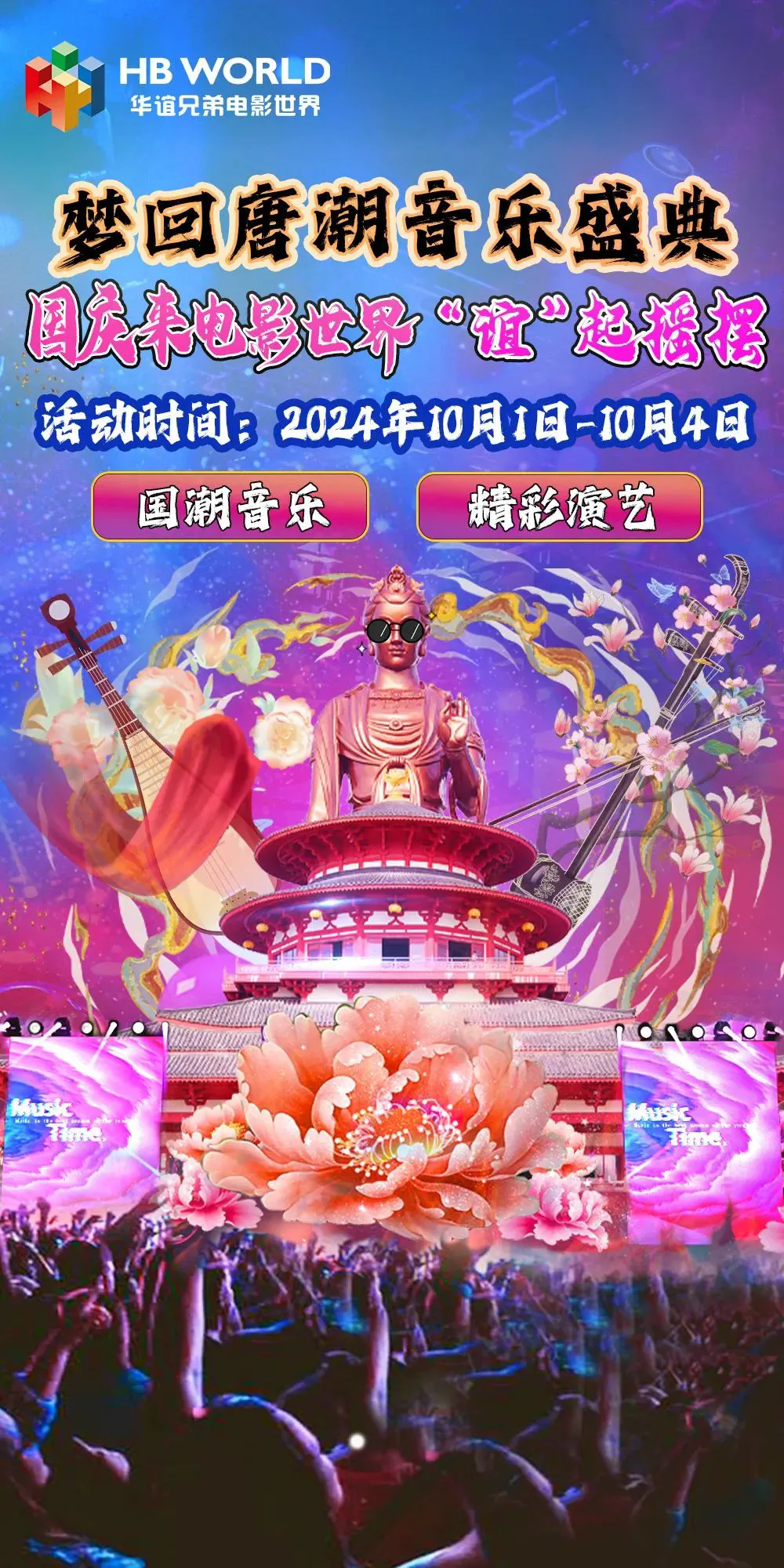 10月1日至4日,華誼兄弟電影世界帶來了“夢回唐潮音樂盛典”。每天50場+演出,紅紅火火迎國慶,現(xiàn)場唐樂演奏、國潮DJ、鼓踏飛燕熱鬧非凡!更有20+游樂設(shè)施免費游玩包你值回票價!