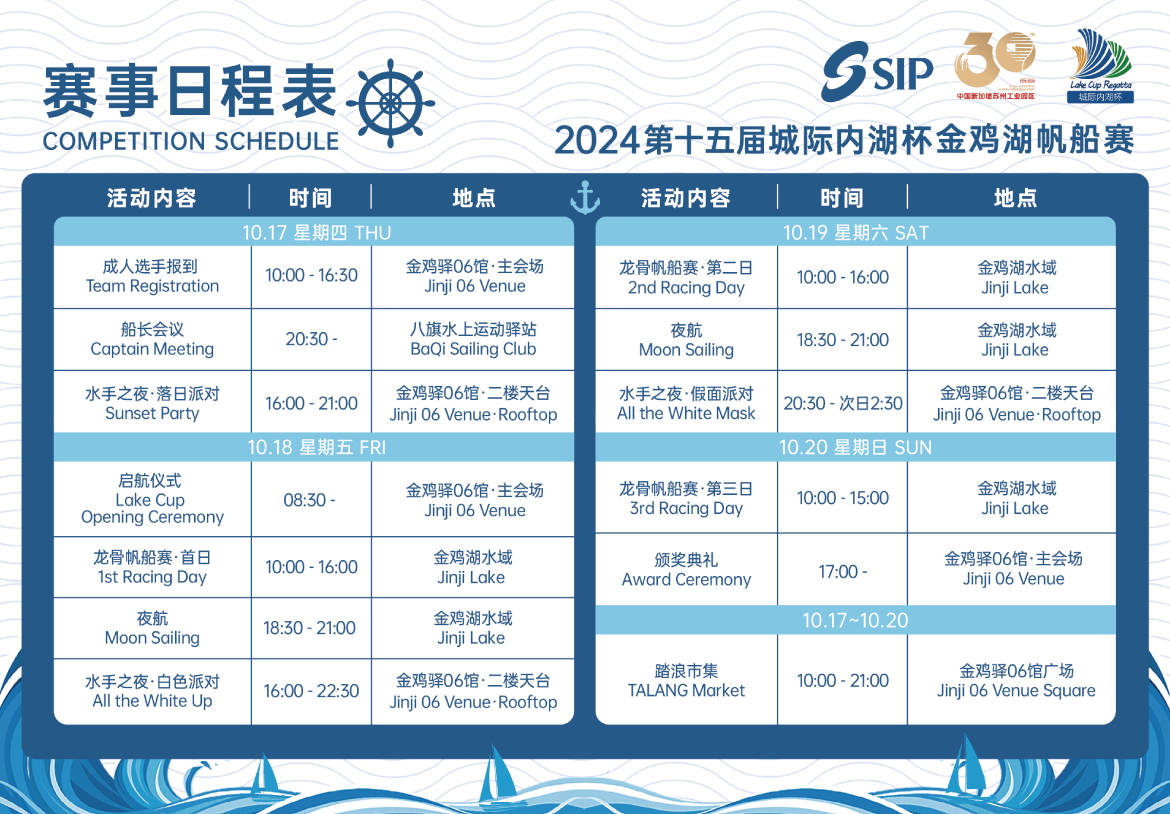 10月18日,第十五屆城際內湖杯金雞湖帆船賽在園區望湖角帆船碼頭正式開賽。中國帆船帆板運動協會副主席劉衛東,蘇州市政府副秘書長謝飛,蘇州市體育局局長闕明清,蘇州工業園區黨工委委員、管委會副主任、宣傳和統戰部部長朱江出席啟航儀式。作為園區三大品牌... [MORE]
