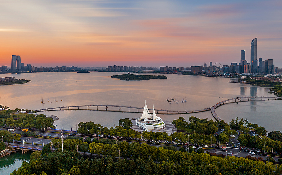 在開發(fā)建設30周年之際,園區(qū)積極以新載體撬動經(jīng)濟“新引擎”。金雞湖驛站改造是環(huán)金雞湖區(qū)域綜合提升工程中的重要舉措。其中,金雞驛06館位于望湖角帆船碼頭,緊鄰金水灣棧橋,定位為集水上運動、餐飲和公共服務為一體的綜合服務設施。驛站頂部設有巨型帆船雕塑,與湖邊停泊的點點帆船,構(gòu)成了時尚美麗的城市風景線。