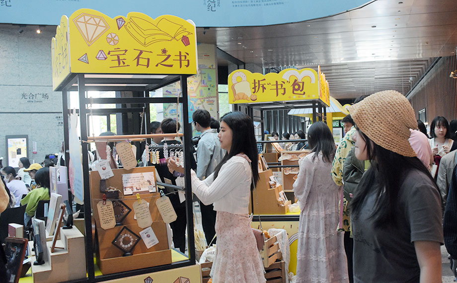 有人將“守護古籍,讓文字活起來”作為畢生的追求,也有人通過閱讀,將傳統文化之美內化為靈感乍現,開啟璀璨的創新之旅。中式飾品品牌“青沅”主理人李晴媛正是一位愛閱讀的設計師?!皩毷畷闭刮磺埃蚴忻癯尸F珠飾與文學交融的美學空間。“在這座文化名城、書香之城,飾品已經不僅僅是一種裝飾,更是一種文化和意境的呈現?!崩钋珂卤硎?,即便同一種寶石,因顏色、大小、搭配的不同,也能展現各具特色的韻味,而她希望自己的設計能把傳統文化之美用現代的方式傳遞出去?;顒蝇F場,她推出了命運寶石盲抽活動,愛閱之人盲抽一顆水晶石,根據顏色說出對應類型的書名,即可獲得天然水晶戒指一枚。創意的玩法引得市民游客紛紛投入與命運寶石的“雙向奔赴”。