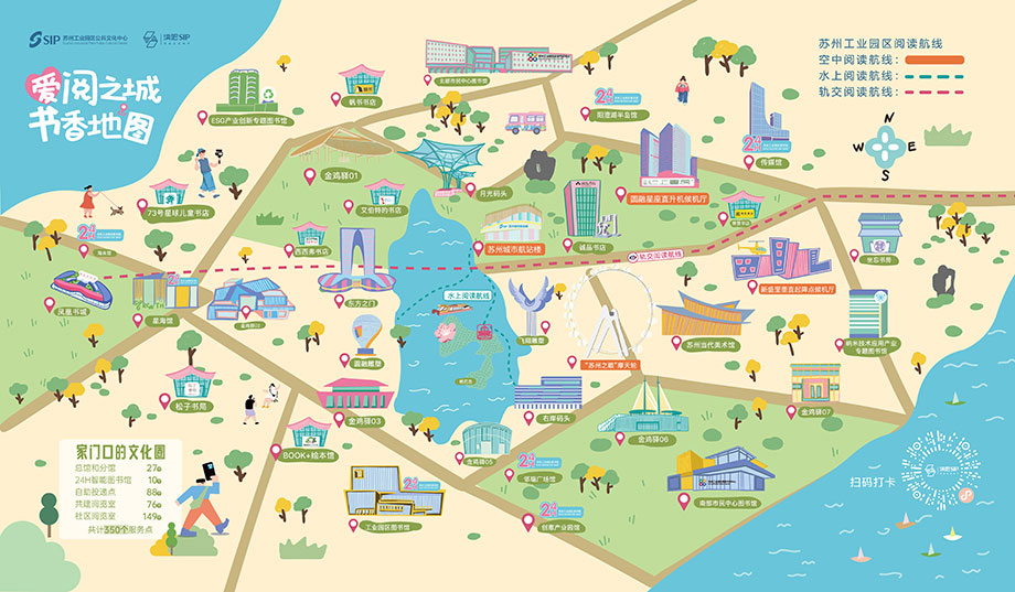 以摩天輪“云端書艙”為齒輪,“空中閱讀”“水上閱讀”和“軌交閱讀”三大閱讀航線同步啟航,從湖面到云端,從地鐵到書站,以開放性、創(chuàng)意性、融合性的新型閱讀空間,三維立體塑造園區(qū)流淌的閱讀網(wǎng)絡(luò)。其中,空中閱讀航線將在蘇州城市航站樓、圓融星座直升機(jī)候機(jī)廳、新盛里垂直起降點(diǎn)候機(jī)廳為旅客提供數(shù)字閱讀服務(wù);水上閱讀航線將閱讀觸角延伸至“金雞湖號(hào)”雙體新游船、桃花島游客中心,提供“園區(qū)文旅”掃碼聽、休閑讀物隨手閱的文旅閱讀服務(wù);軌交閱讀航線則重點(diǎn)圍繞軌交1號(hào)線,串聯(lián)沿線品牌書店、24小時(shí)圖書館、高客流量站點(diǎn)及文商旅機(jī)構(gòu)的優(yōu)質(zhì)閱讀資源。