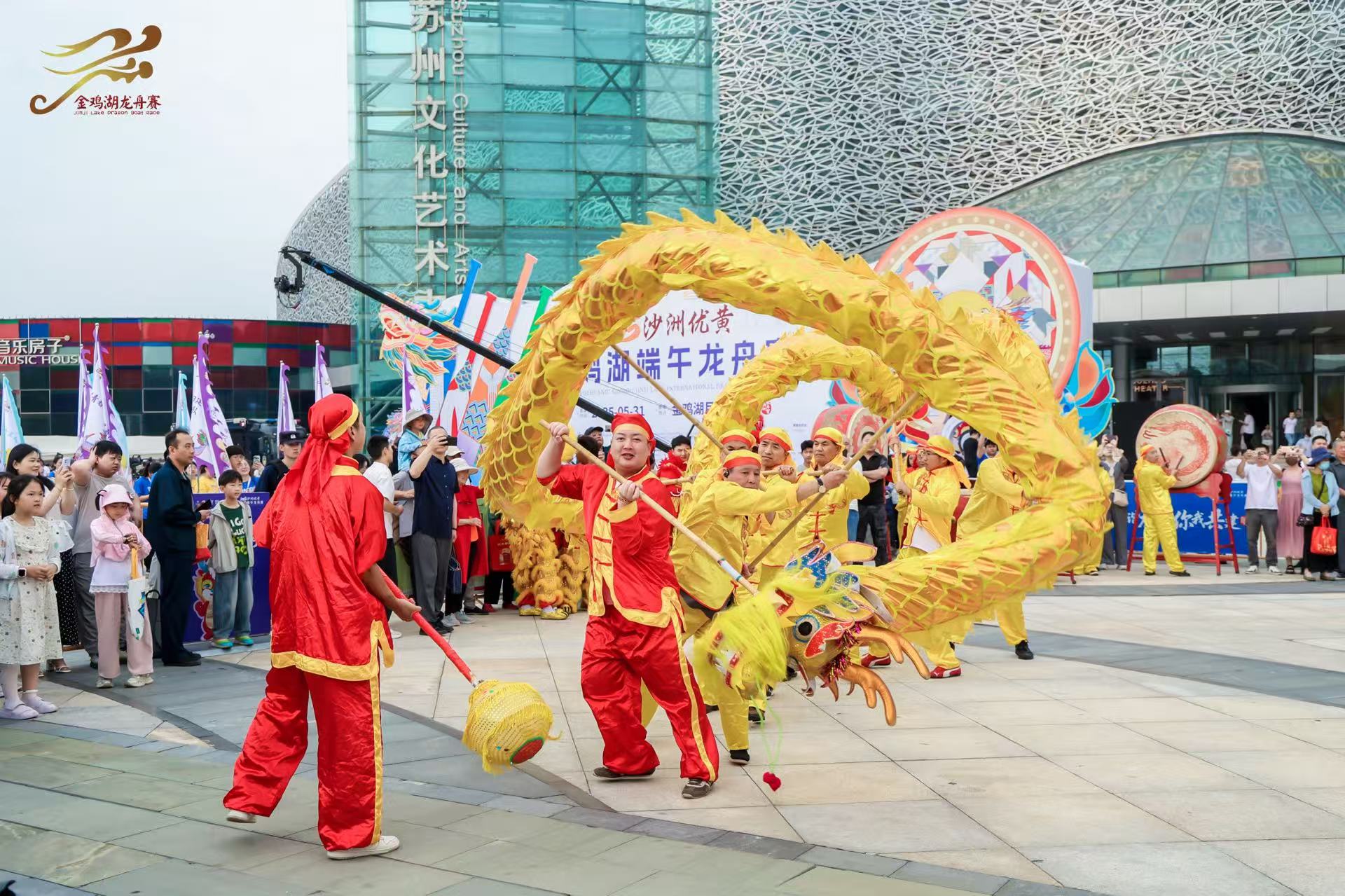 吉祥喜慶的舞龍舞獅表演,拉開今日龍舟賽的序幕。金雞湖畔的最佳觀賽視角,早早便擠滿了人。