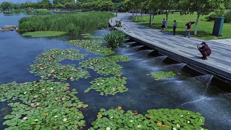 昨天,環金雞湖步道新安裝的凈水系統啟用,一排噴頭不斷向湖面噴射清水,使湖水快速流動,有效防止藍藻滋生。清澈的湖面上睡蓮盛放,引來行人駐足觀賞。
