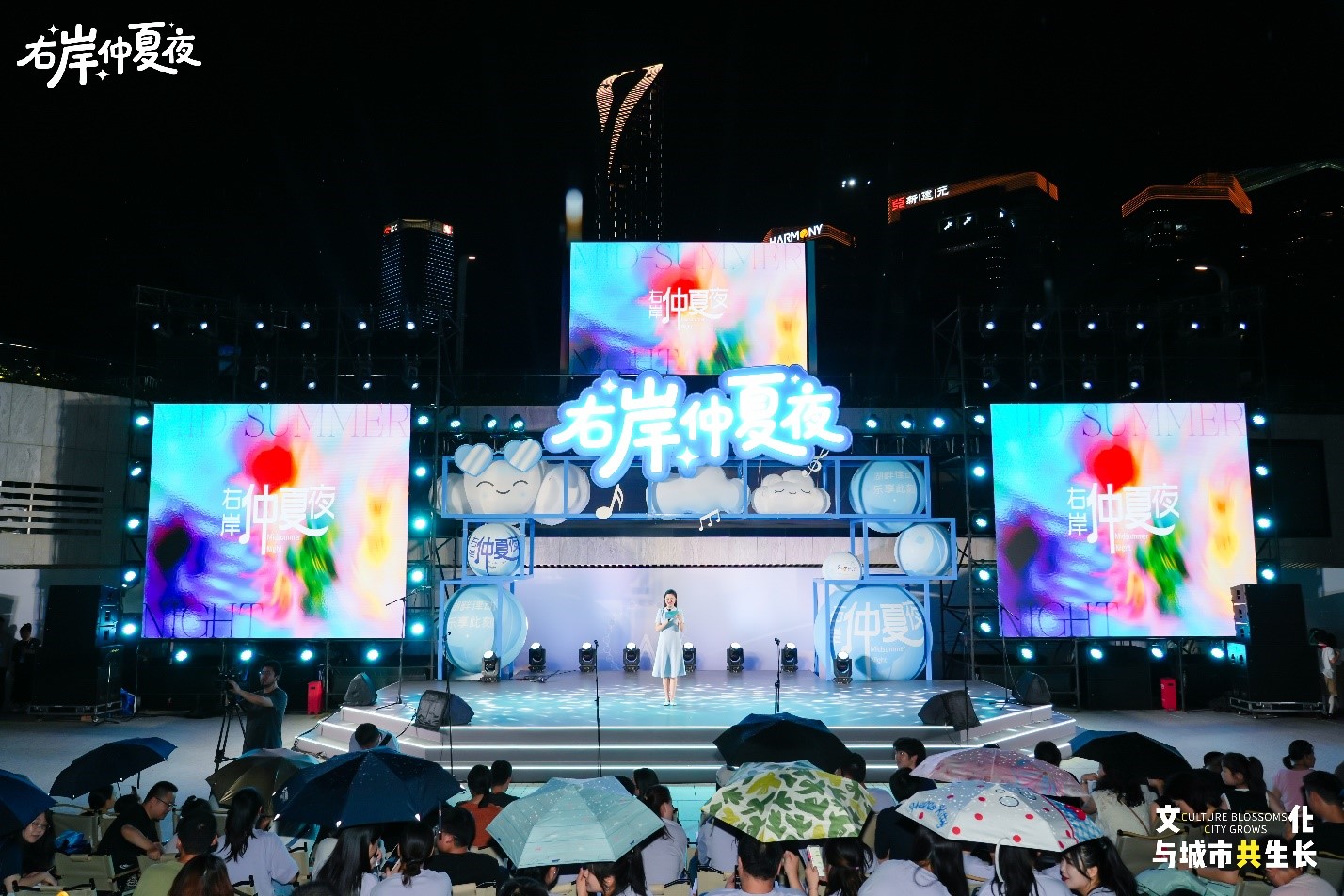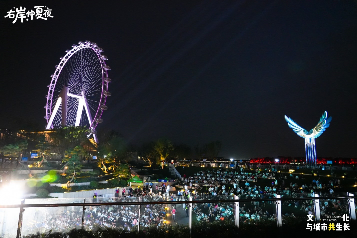 暮色漸沉,舞臺的燈光愈發耀眼,右岸客廳廣場的草坪上,觀眾們沿著坡度有序落“座”,翹首以待。