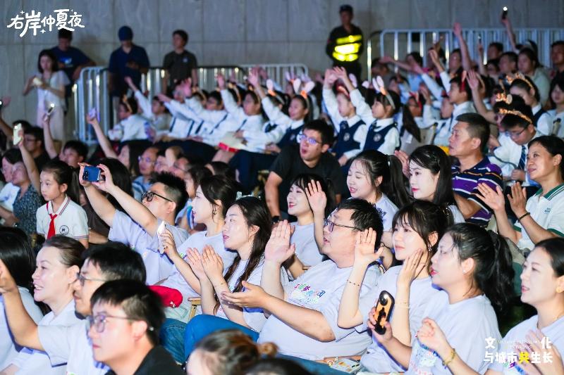 舞臺下,觀眾們也是熱情滿滿,一邊揮動手機照明燈,一邊跟著旋律哼唱,一曲結束,隨即給予歡呼和掌聲。慕名而來的游客劉女士就在演出中收獲了滿滿感動:“之前就在社交媒體上看到了右岸仲夏夜活動,現場感受更加特別。教師節專場回憶BUFF疊滿,師生互動更加溫馨感人!”