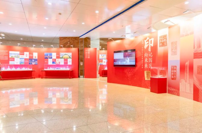 直播鏡頭跟隨導(dǎo)覽人的腳步,深入解讀了展覽的兩大構(gòu)成部分。第一部分“印記園區(qū)”以94枚全新創(chuàng)作的印章,構(gòu)建出“領(lǐng)航壁畫”“志合山海”“吳風(fēng)湖韻”“勇立潮頭”“盛世江南”五大篇章。這些作品不僅凝結(jié)了園區(qū)篆刻愛好者與專業(yè)工作者的創(chuàng)意巧思,更特別聚焦于園區(qū)的經(jīng)濟發(fā)展、科技創(chuàng)新、自然景觀與產(chǎn)城融合圖景進(jìn)行創(chuàng)作,讓古老的篆刻藝術(shù)與園區(qū)的現(xiàn)代化發(fā)展深度交融。