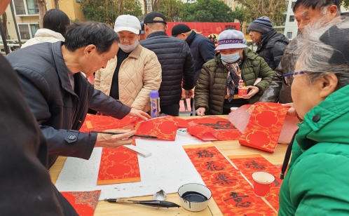 在東湖大郡三期廣場,社區聯合建屋物業開展便民服務集市,吸引了眾多居民駐足參與,現場煙火氣與年味兒交織,暖意融融。寫春聯攤位前墨香四溢,書法愛好者揮毫潑墨、筆走龍蛇,將新春的美好期盼與真摯祝福融進一幅幅紅底黑字的春聯中。居民們捧著墨跡未干的春聯,臉上滿是幸福的笑容,爭相將這份年味與福氣帶回家中。