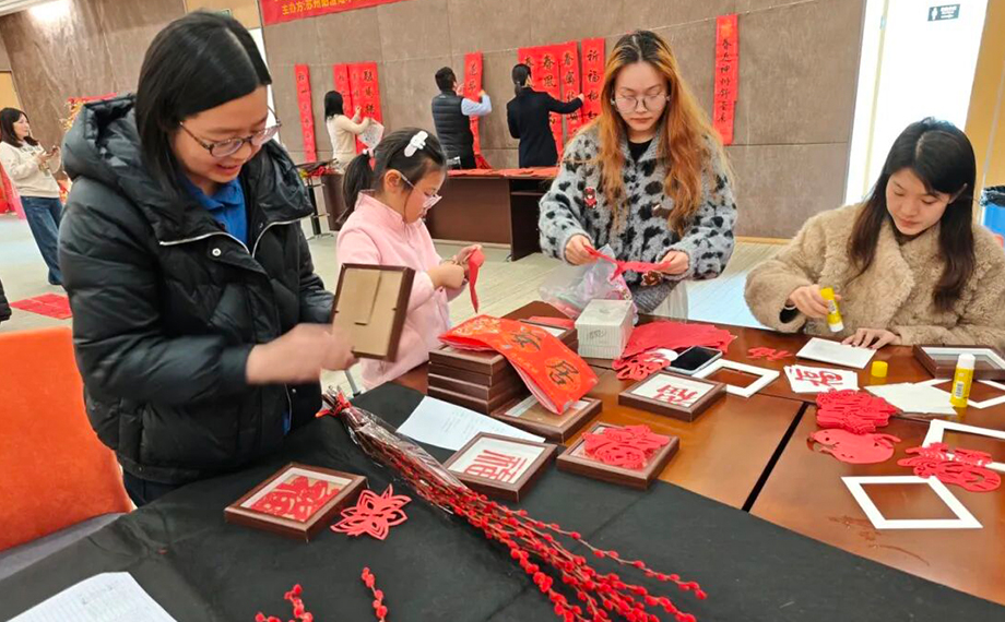 活動(dòng)現(xiàn)場(chǎng)氣氛熱烈,紅紙翻飛,墨香四溢。提筆落墨間,“春風(fēng)送暖花千樹 駿馬揚(yáng)蹄路萬程”“闔家安康皆如意 滿門福氣盡亨通”等一副副新春祝福春聯(lián)和“福”字躍然紙上。參與者們揮毫潑墨,親手書寫“春風(fēng)得意”“平安喜樂”等祝福語,感受中華優(yōu)秀傳統(tǒng)文化的魅力;剪刀翻飛下,一張張紅紙化作“福”字、馬年生肖等主題窗花,增添了節(jié)日的喜慶氛圍;在體驗(yàn)拓印技藝的過程中,大家將“馬上有福”“2026 福”等字樣拓印在紅紙上,收獲了各具特色的新春裝飾。共同迎接新年的喜悅,拉近了度假區(qū)企業(yè)、社區(qū)之間的距離,營(yíng)造出“企業(yè)共建、鄰里和睦”的和諧氛圍,為區(qū)域資源聯(lián)動(dòng)奠定了良好基礎(chǔ)。
