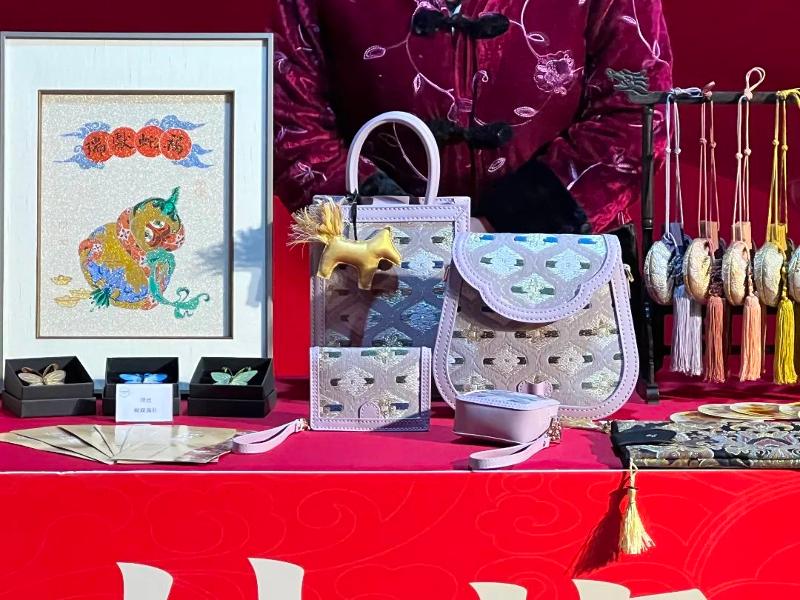此次參展,仁和織繡充分結合蛇年、非遺等主題,帶來了一系列兼具藝術價值和實用功能的新品,并搭配傳統的福字擺件、香囊等產品傳遞濃濃的新春祝?!,F場的緙絲“學習機”也吸引了眾多市民游客參與體驗?!拔覀儗⒊浞职l揮非遺傳承保護單位的優勢,聚焦非遺做好宣傳、推廣,以及色彩教育的科普工作?!敝x晴容介紹說。