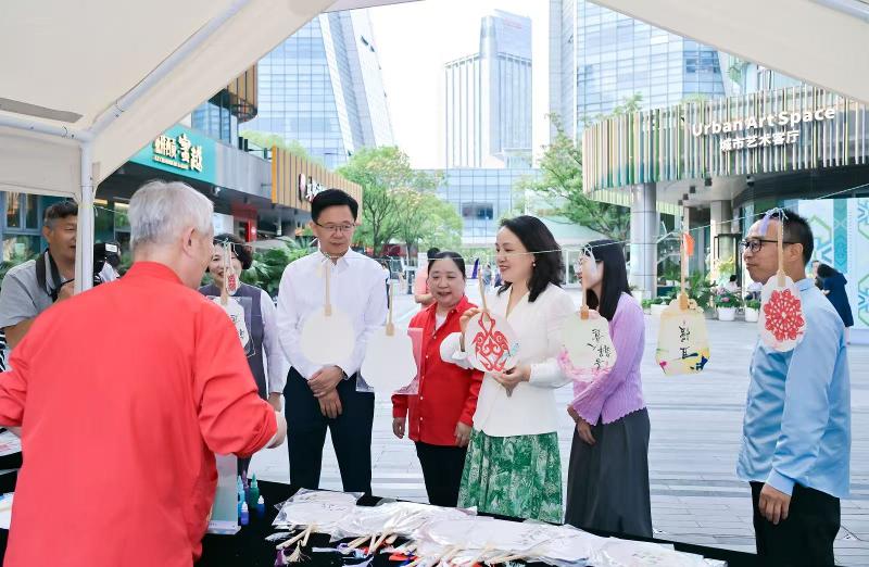 活動中,青年評彈演員朱江帶來以蘇州工業園區為背景的原創曲目《金雞起舞》,以現代藝術形式展現了園區的“古韻今風”,將氣氛推向高潮。現場熱鬧非凡,市民游客不僅觀賞到了精美的緙絲藝術展,還積極參與了吹糖人、漆扇制作等互動體驗。這些端午傳統民俗活動讓市民在感受文化魅力的同時,也充分體驗到了節日的祥和氛圍。