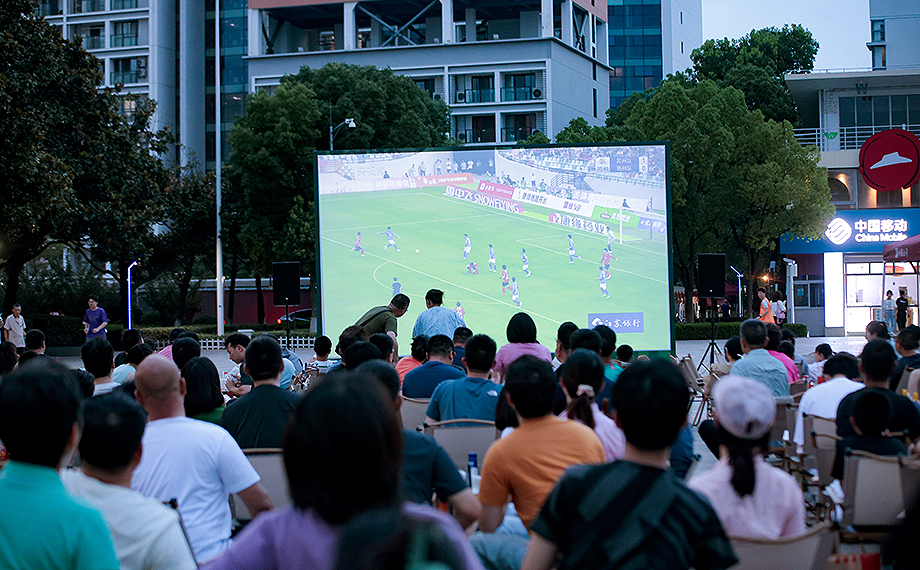 “開始了,開始了!”晚上7點,隨著蘇州隊迎戰揚州隊的哨聲響起,文星廣場的投影前爆發出陣陣歡呼聲。迷們或坐或站,眼睛緊盯著屏幕上的每一次傳、射門。每當有隊伍發起進攻,現場便掀起一陣聲浪。比賽開始一分多鐘,蘇州隊的率先進更是在現場掀起第一波高潮。