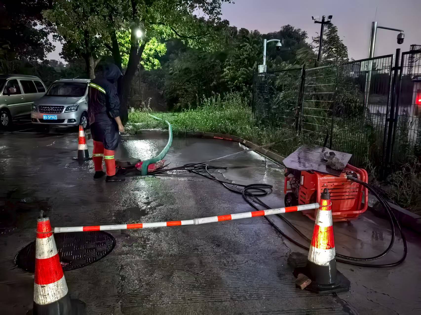 在婁葑街道,老小區東港新村一組團東106、107幢居民樓因地勢低洼、一樓無車庫緩沖,積水快速上漲至窨井蓋以上。接到防汛預警后,婁葑街道立即啟動應急響應,華葑市政搶修團隊一小時內抵達現場,架設抽水泵強排積水、清理排水口雜物、設置警示標識引導居民繞行,有力有序地助力居民恢復正常生活秩序。