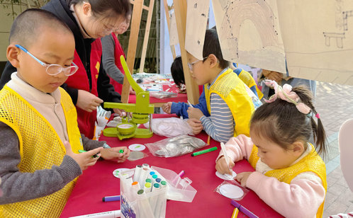 為了讓居民們進一步親身感受文創的魅力,活動現場還特別設置了文創體驗區。在“徽章DIY”臺前,孩子們可以繪制自己喜歡的圖案,動手制作一枚獨一無二的專屬徽章。在“年輪木片掛件書法文創”體驗點,參與者們則通過紅管志愿者指導,天然的年輪木片上題寫詩句或祝福,制作完成了一個充滿古風雅韻的掛件。這些互動體驗不僅妙趣橫生,更讓江南文化在人們的親自動手過程中得以內化與傳承。