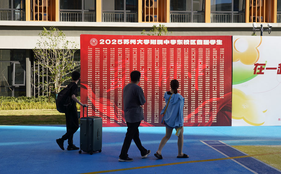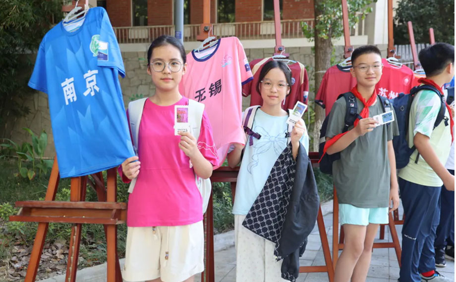 七年級新生的入校儀式則與今夏熱門話題“蘇超”緊密相關。在校園西側,蘇超十三城的球衣迎風舞動,學生們一邊回憶著賽事的精彩,一邊與喜歡球隊的球衣合影。星灣學校副校長杜紅芳介紹:“學校希望通過這種安排,讓孩子們感受運動員團結奮進、努力拼搏的精神,成為有擔當、有勇氣、有信念、有信念的星灣學子。”