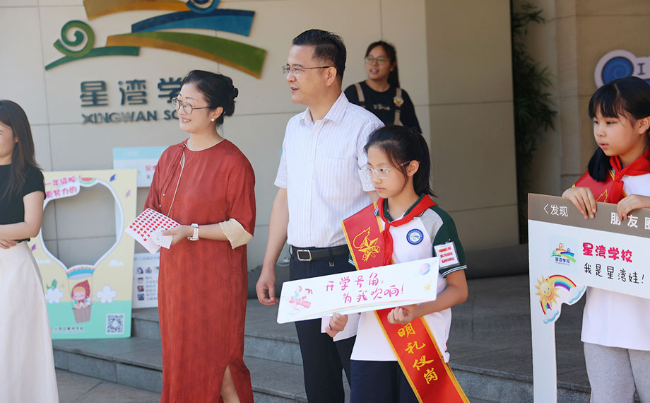 貼上小紅星,一年級新生的臉上滿是喜悅。他們與爸爸媽媽一起走進校園,在打卡裝置前拍照留影,發出“我是星灣娃”“我上一年級啦!我會更努力”等“宣告”。一年級新生陳千阡對星灣的學習生活充滿好奇也飽含期待,她興奮地表示:“我的目標是成為一名班長,我會加油努力!”