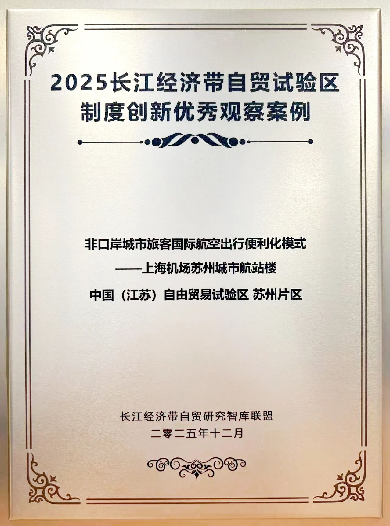 近日,“2025長江經(jīng)濟(jì)帶自貿(mào)試驗(yàn)區(qū)制度創(chuàng)新優(yōu)秀觀察案例”12項(xiàng)獲評案例公布,中國(江蘇)自由貿(mào)易試驗(yàn)區(qū)蘇州片區(qū)的“非口岸城市旅客國際航空出行便利化模式——上海機(jī)場蘇州城市航站樓”榜上有名。