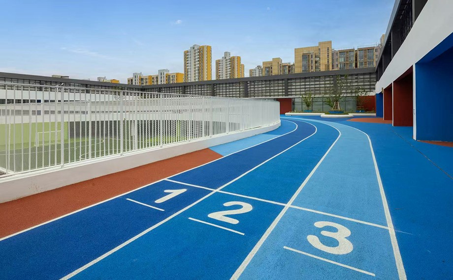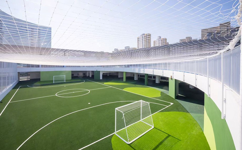 The campus offers a diverse range of distinctive sports facilities, such as the circular running track on the first floor, an outdoor football field on the fourth floor, the rooftop running track on the fifth floor, and the indoor badminton court on the eighth floor.