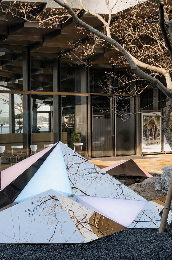 Nearby, at Jinji Station 09, another installation, named “Die Shi Kui Tian”, features a more Eastern aesthetic style. Inspired by rockeries in Suzhou’s classical gardens, its geometric lines reimagine traditional decorative rockery art. Also made of stainless steel, it captures the sky, clouds, architecture and visitors within its angles, folding the world into a miniature “mirror courtyard”. Notably, its colors shift with natural light.