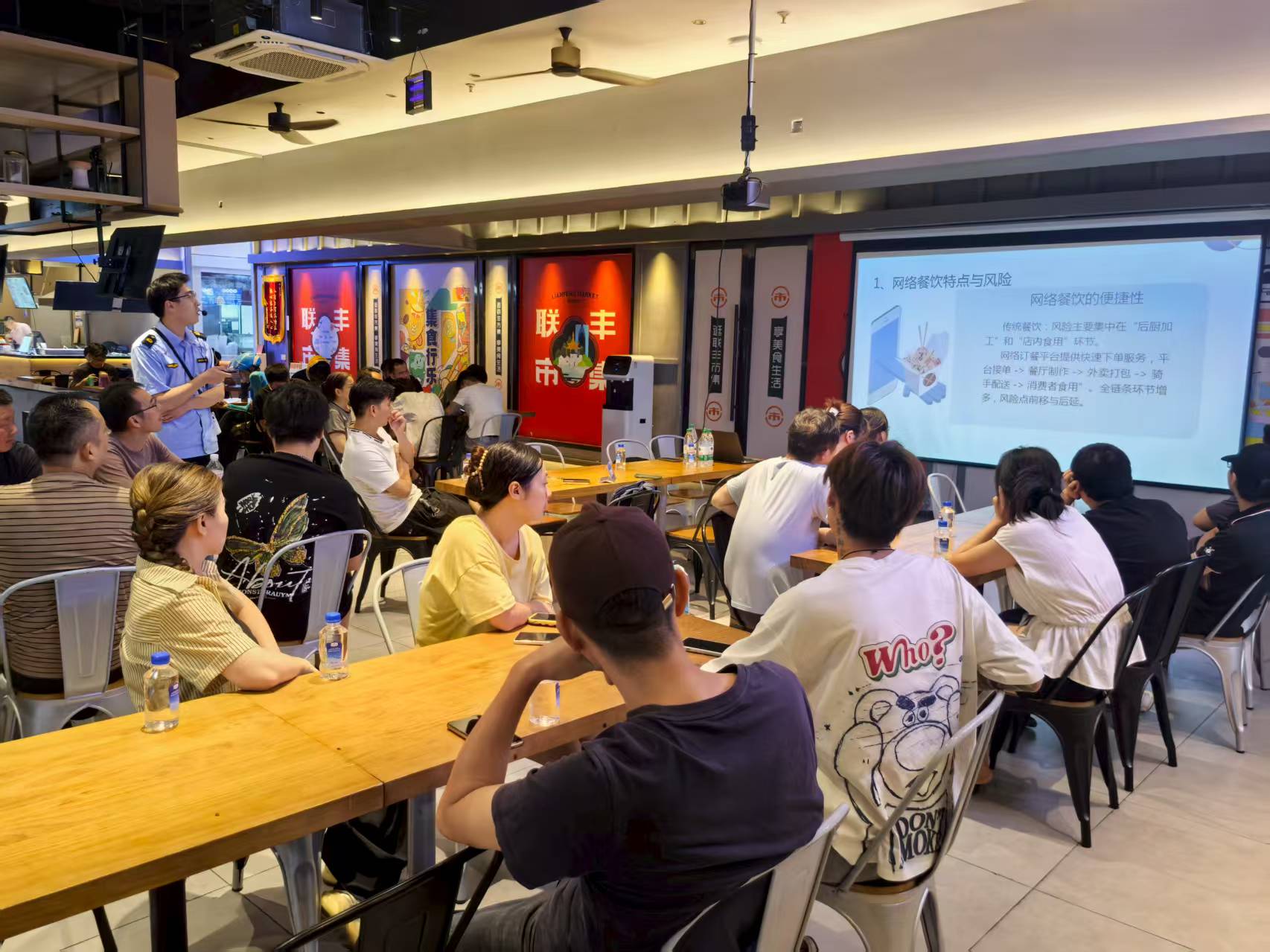 本次培訓面向聯豐廣場網絡餐飲服務集中區的餐飲單位從業人員,重點圍繞《中華人民共和國食品安全法》《網絡餐飲服務食品安全監督管理辦法》等法規展開系統性講解,詳細解讀餐飲單位主體責任、食品加工操作規范、餐食配送管理要求等核心內容。培訓通過典型案例分析,重點強調了超范圍經營、虛假宣傳、衛生條件不達標等常見問題的整改措施,并針對食品采購溯源、儲存加工規范、外賣封簽使用等關鍵環節進行了講解。最后現場工作人員與參會單位人員進行互動,針對餐飲單位經營者提出的問題,一一進行解答。