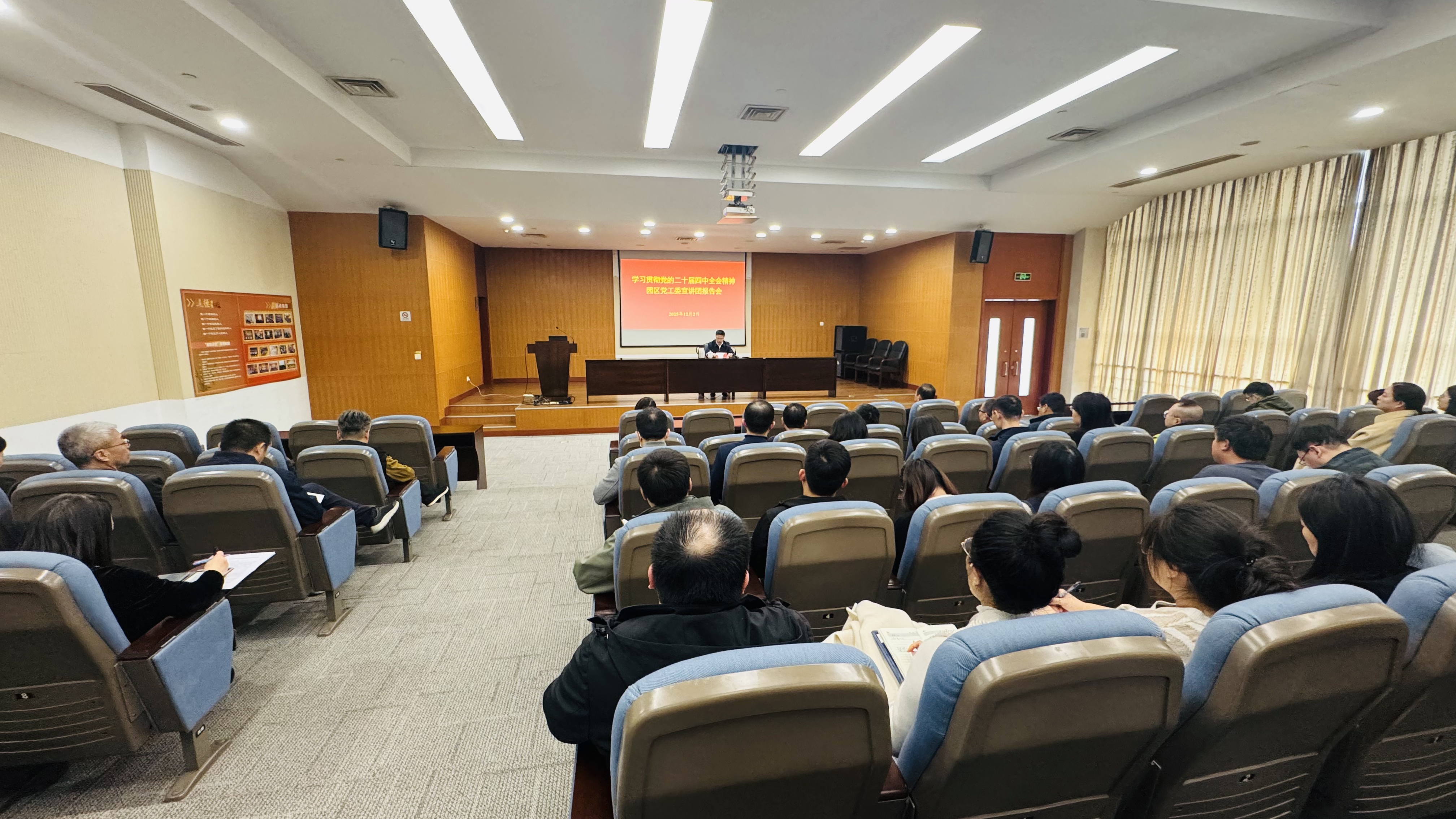 園區黨工委宣講團成員、市場監督管理局局長、黨委書記陸锃作宣講報告。陸锃圍繞黨的二十屆四中全會的重大意義、精神實質和實踐要求,以及《中共中央關于制定國民經濟和社會發展第十五個五年規劃的建議》的核心要義,進行了系統闡釋和深入解讀,并結合園區發展實際和市場監管職能,對如何抓好全會精神的貫徹落實提出了明確要求。