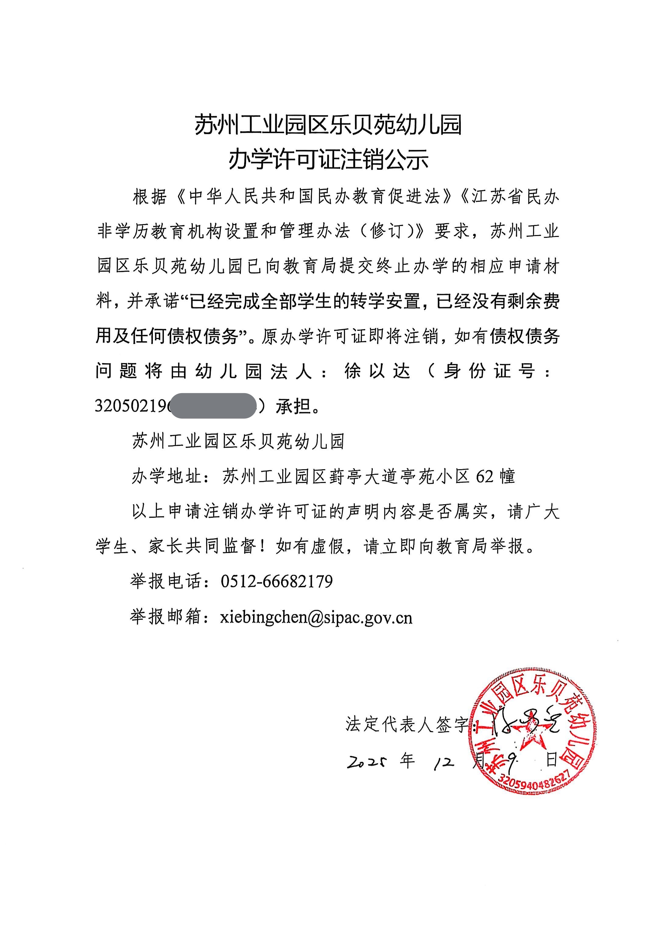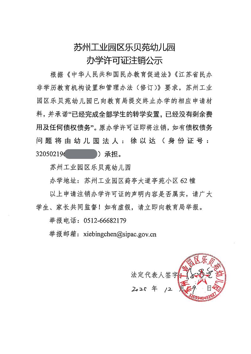 蘇州工業園區樂貝苑幼兒園辦學許可證注銷公示